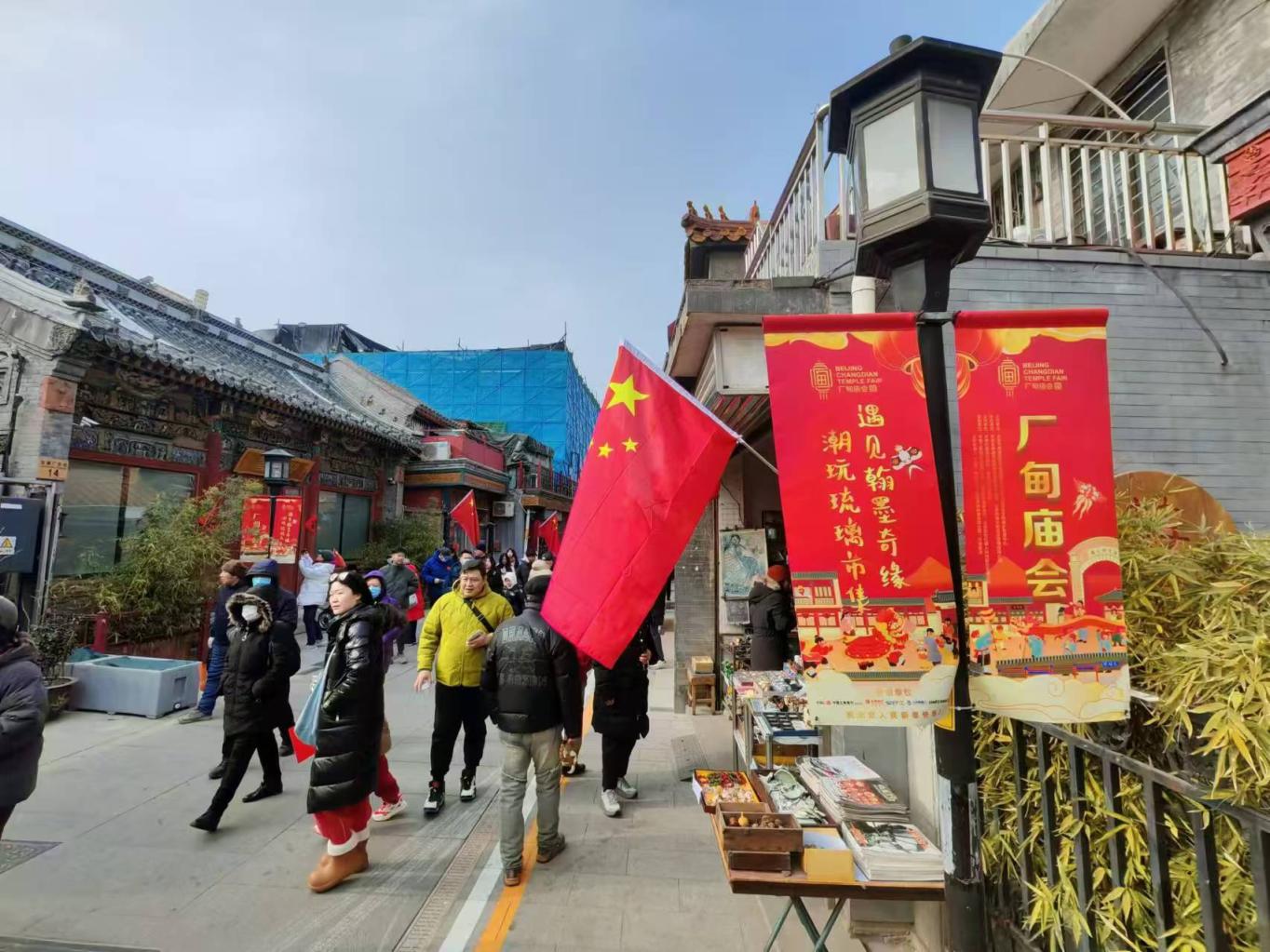 厂甸庙会在怒放街区举办,主要踱步在东西琉璃厂。记者从大栅栏向西,一齐穿过杨梅竹斜街,东说念主群越来越密集,年味也越来越近。来到琉璃厂东街东口,娇娆的说念旗和五星红旗,沿途装点着节日中的厂甸庙会。