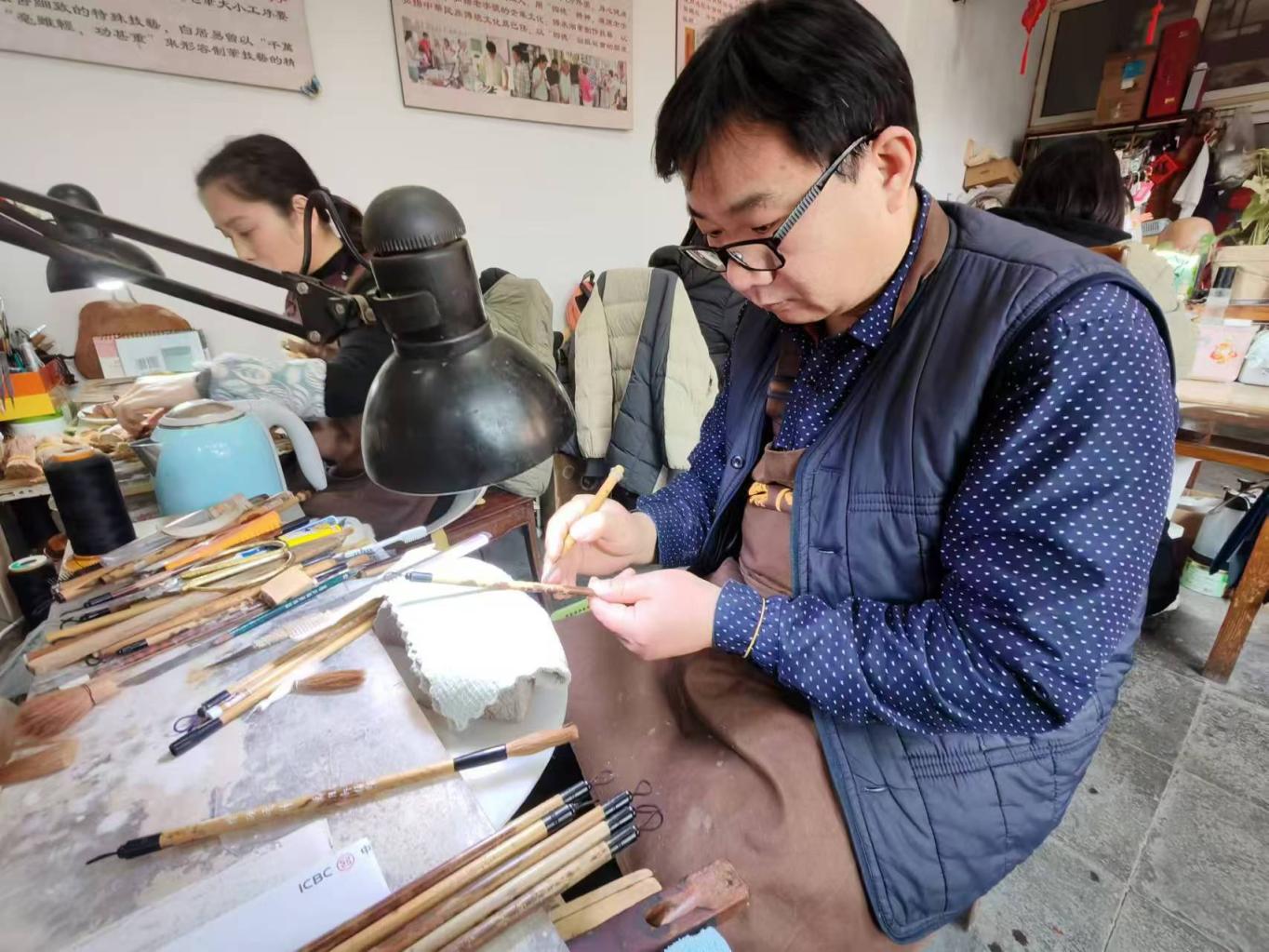 在戴月轩琉璃厂东街店,王后显正跟搭客们互动,靠近面调换湖笔制作工艺。