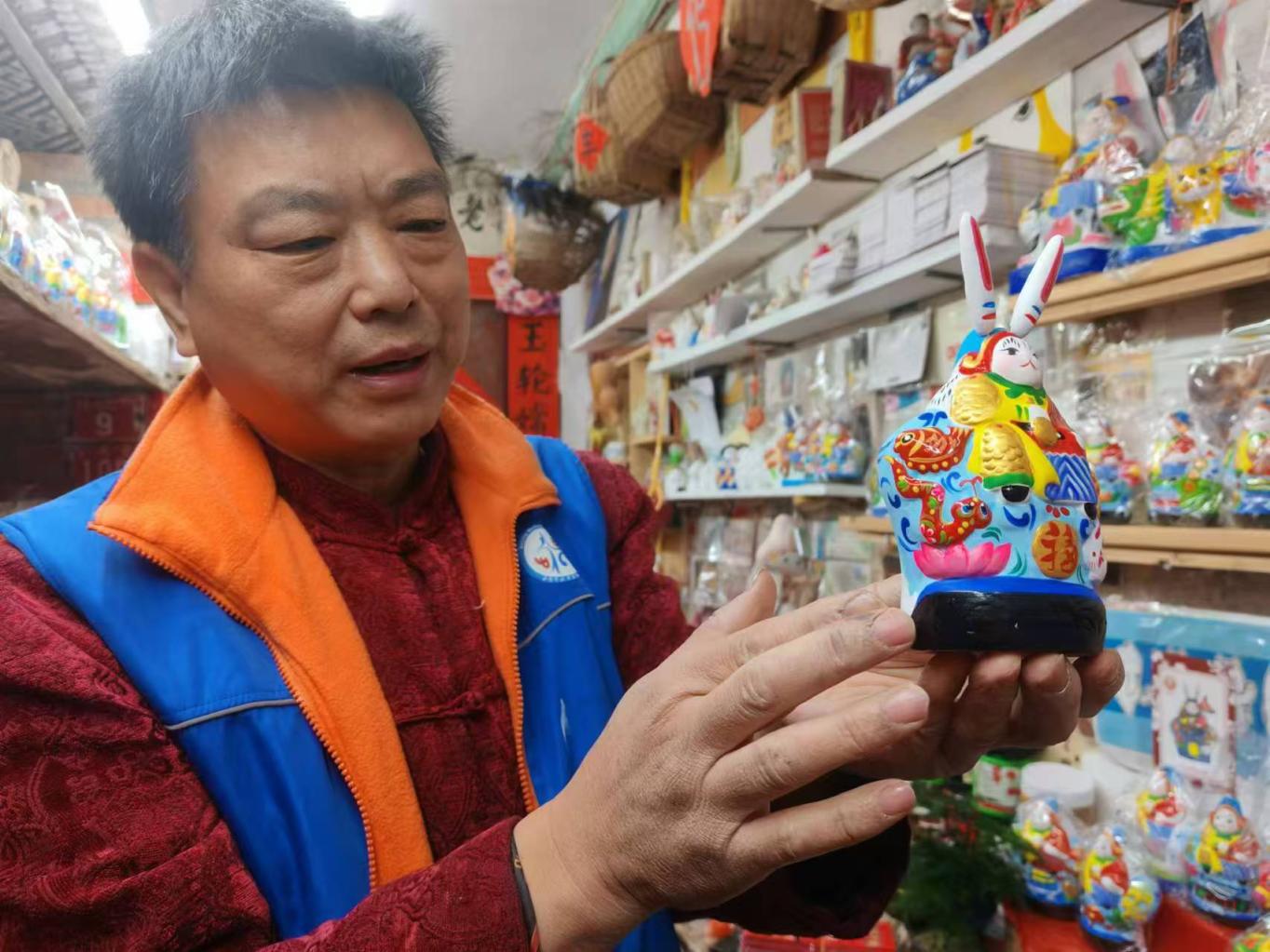 “小孩小孩你别挤,到了厂甸即是集。东说念主山东说念主海来踩岁,踩了岁,智谋伶俐长一岁,四季平定长一岁。”在我主张于琉璃厂的店铺里,张忠强师法旧时交易东说念主的口气,一边用手打着节律、一边唱出一段歌谣。此时,店内东说念主头攒动,市民、搭客,在挑选琳琅满打算兔儿爷。